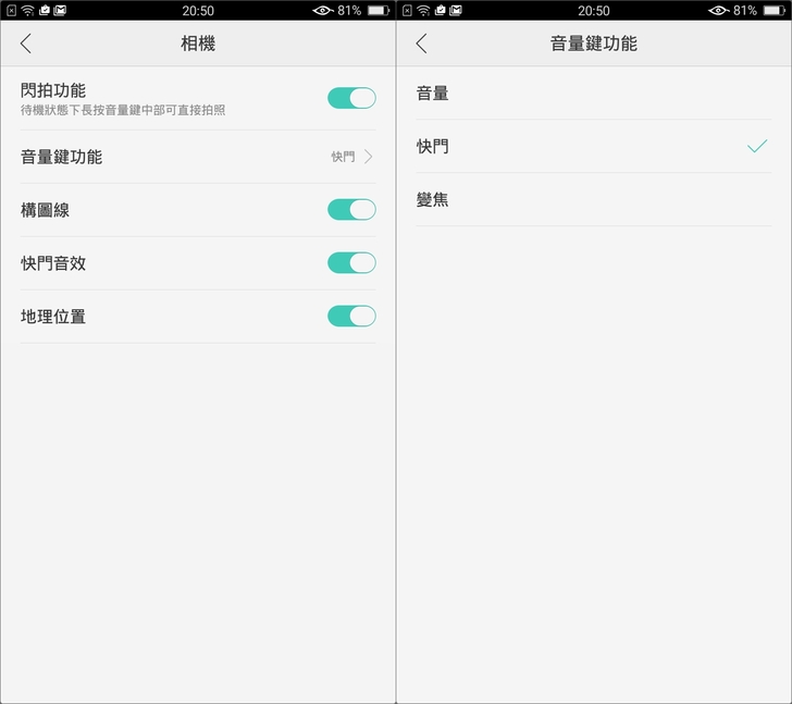 【▼】相機中的設定中,能開啟閃拍功能,閃拍功能就是待機模式下長按音量鍵中部可直接拍照,另外音量鍵可作為相機的快門或變焦使用,其餘構圖線、快門音效、地理位置都是貼心的小功能。