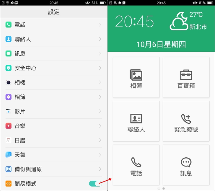 【▼】設定中也可將F1s設定為簡易模式,簡易模式中有相簿、聯絡人、電話、百寶箱、緊急撥號與訊息六大項。