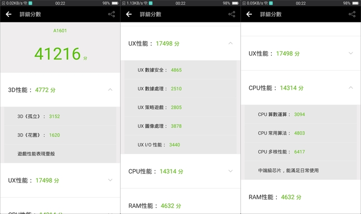 【▼】安兔兔V.6.2.1的測試結果,A1601(F1s)總分為41216分,