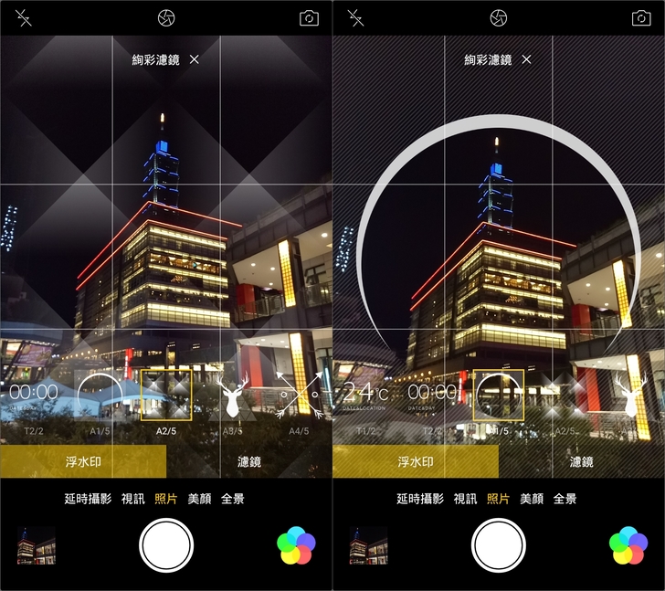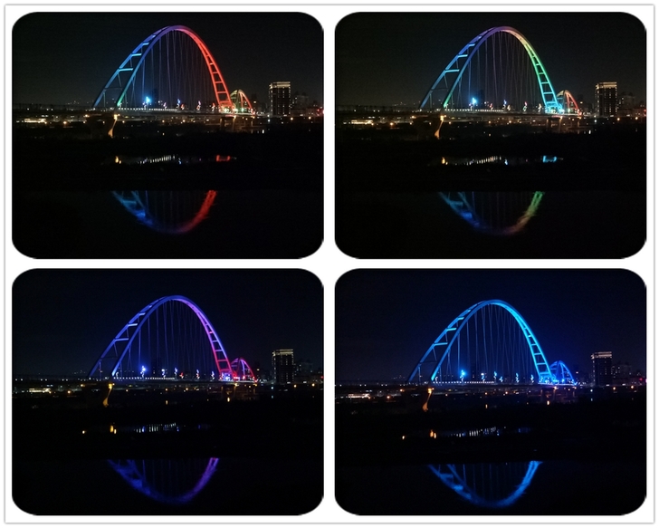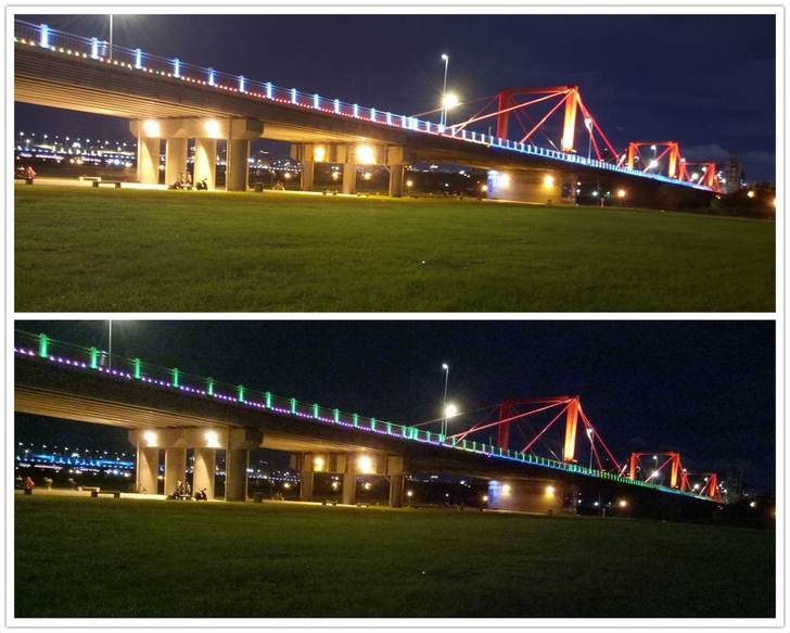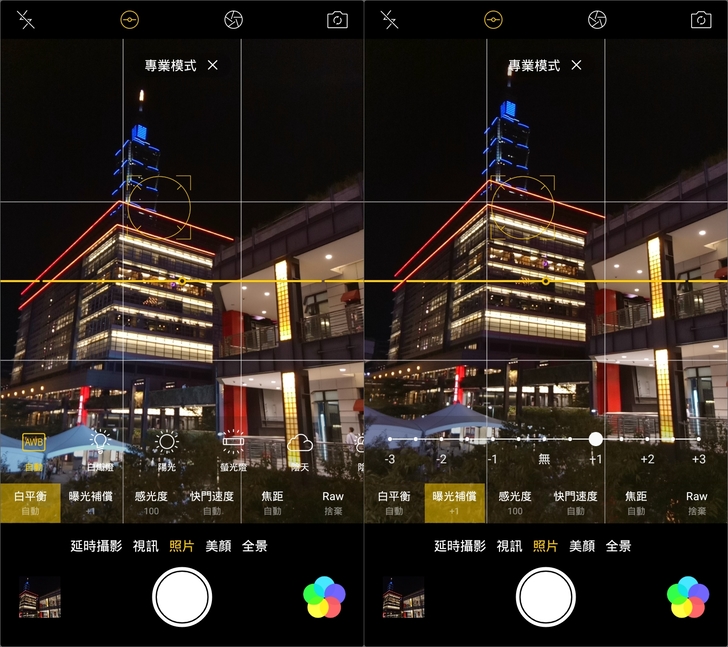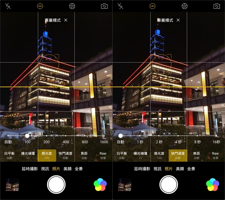 【▼】上面為自動拍照,感覺路燈有點過曝,下方則用專業模式拍攝,調整白平衡與ISO感光度,一樣能拍出好作品。