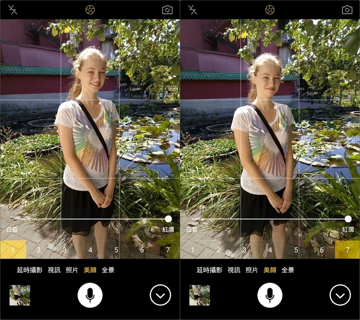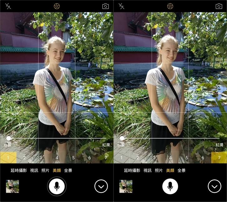 【▼】小編自拍沒人想看,好吧!那就請俄羅斯妹妹示範一下美顏效果吧~F1s美顏效果,左是白皙程度1,右是白皙程度7。
