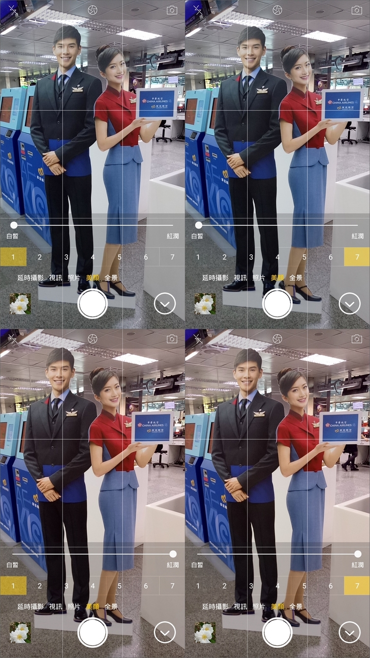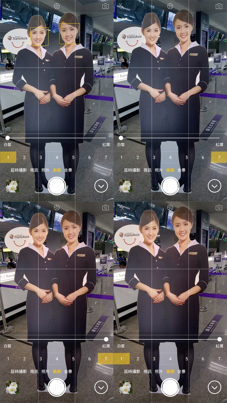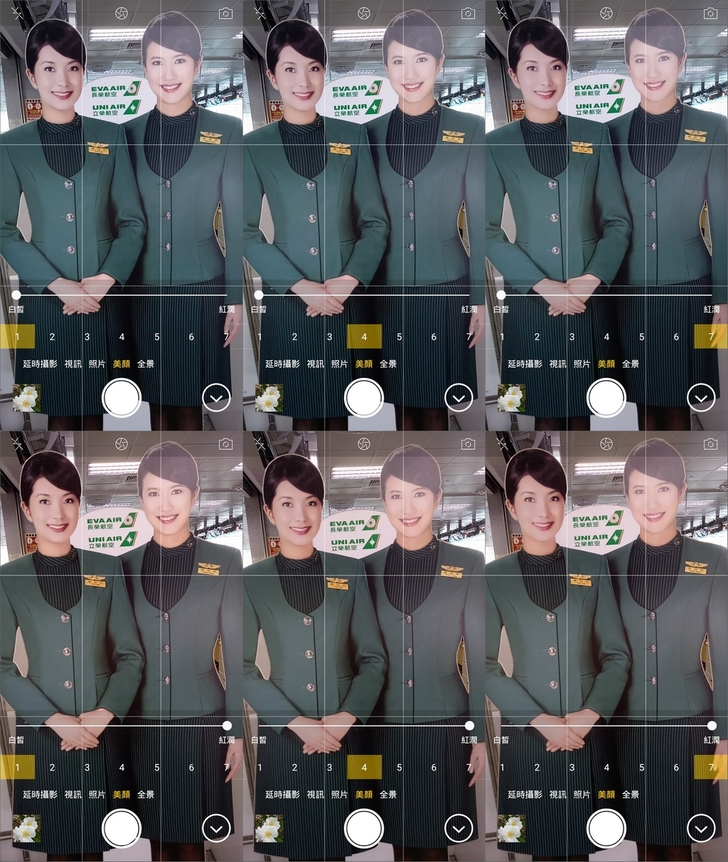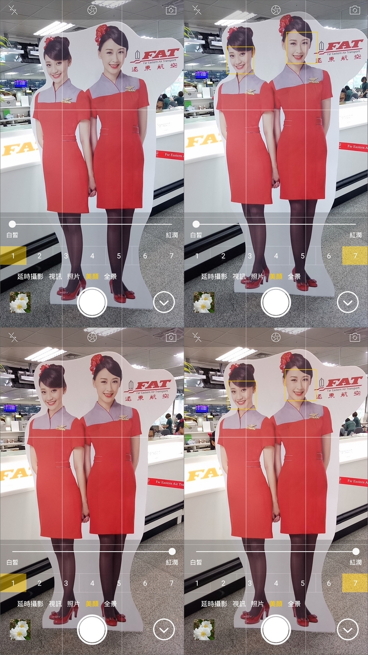 【▼】在機場等友人時,看見各航空公司的人型看板,靈機一動!看看F1s是否也能美顏呢?作這個實驗恥度要很夠,因為大家都會看你究竟要對人型看板作啥壞事...XDDD。首先是長榮航空人型看板,小編分別以白皙、紅潤作程度1、程度4與程度7的自拍,可以發現在紅潤時,綠色的外套會有點偏黃,實驗結果比較適合白皙程度4的效果。