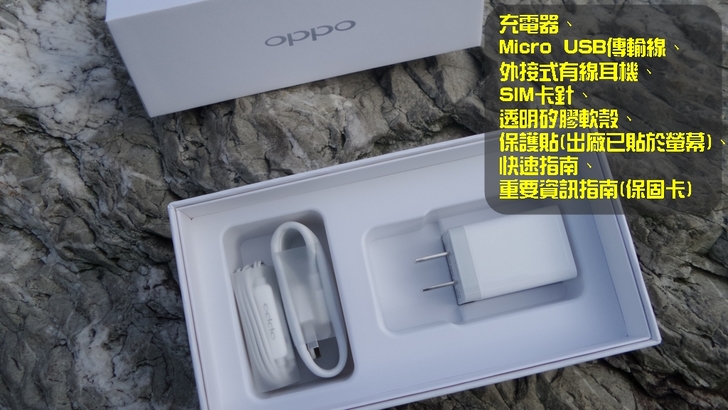 【▼】先賣個關子,先看看有哪些配備吧!充電器、Micro USB傳輸線、外接式有線耳機、SIM卡針、透明矽膠軟殼、保護貼(出廠已貼於螢幕)、快速指南、重要資訊指南(保固卡),有送透明矽膠軟殼、保護貼,目前各大手機廠,還真的只有oppo有送。