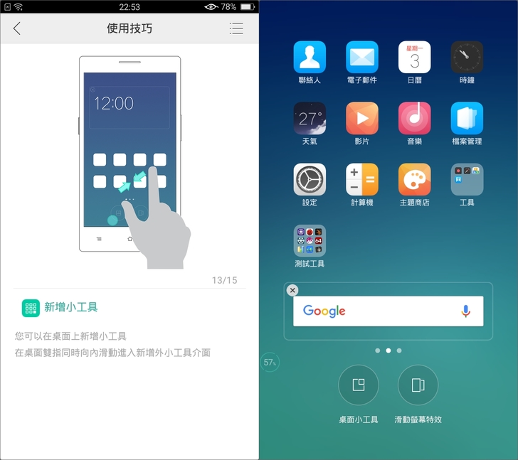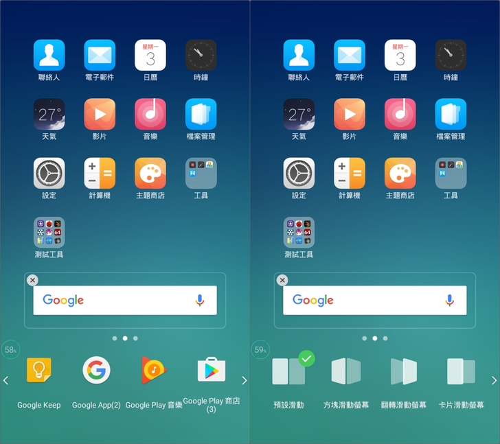 【▼】桌面小工具可依個人習慣來新增,算是快捷的功能;滑動螢幕則提供方塊、翻轉、卡片滑動等特效。