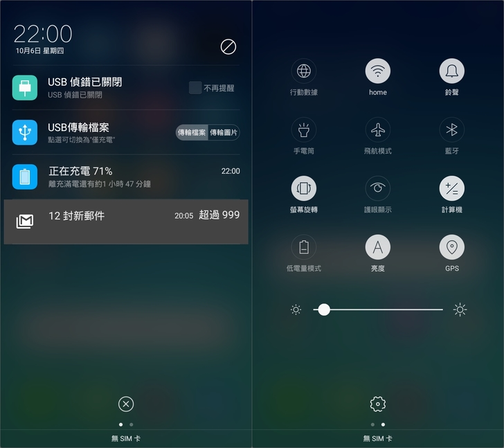 【▼】而在主畫面向下滑則可呼叫出通知訊息與常用的設定,包含了有Wi-Fi連線、藍牙開啟、低電量切換、螢幕亮度調整與GPS定位等等。