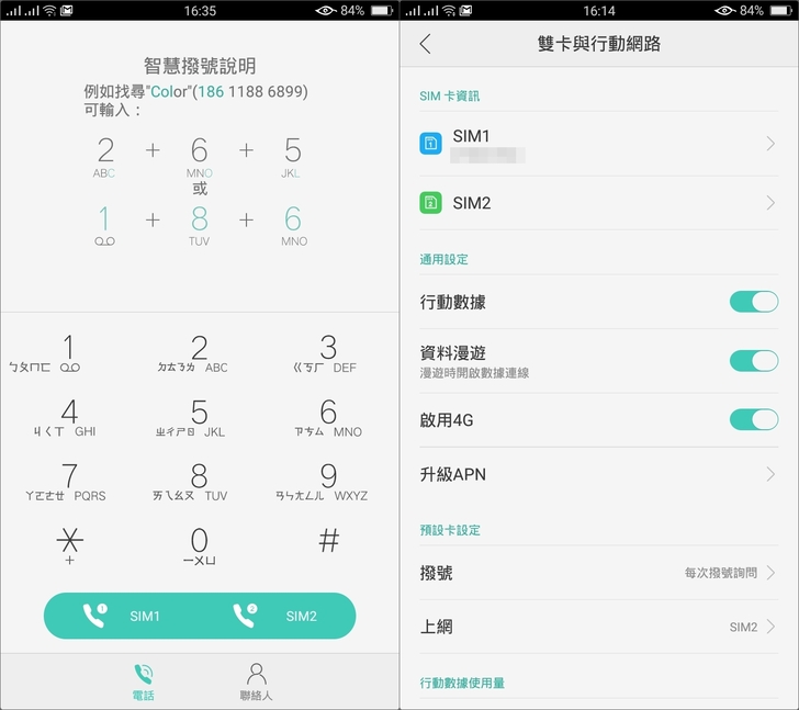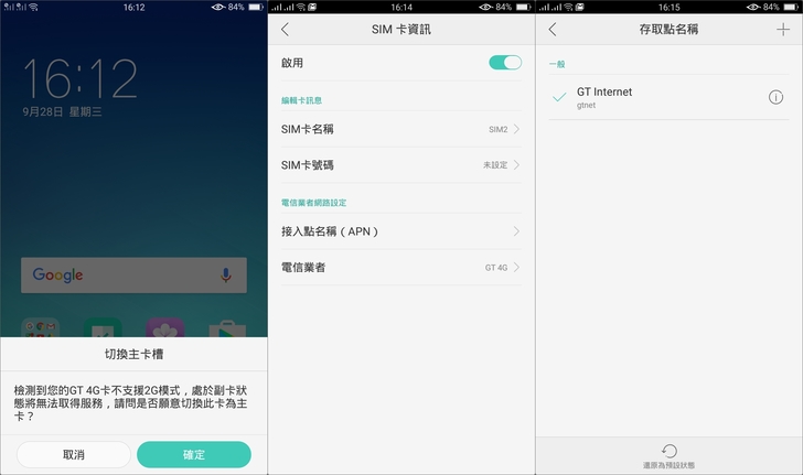 【▼】F1s 4G LTE升級搭載LTE Cat6規格與2CA載波聚合,最高下載速度為300Mbps。由於小編SIM2放的是亞太GT,這是4G的SIM,但F1s SIM2只有支援2G模式,這邊會跳出訊息詢問您是否要切換成主卡,之後兩張卡的服務才能正常使用。