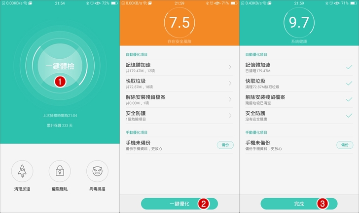 【▼】在ColorOS 3.0桌面上有個安全中心,主要功能能清理加速、權限隱私與病毒掃描。通常只要執行一鍵體檢就能將您記憶體中暫存的資料給釋放與更新病毒碼,來提升整體操作的流暢度,過程中上面可以看見數值與顏色,數值9以上為綠色代表系統健康,橘色則是代表有風險,若呈現紅色那就要注意了!