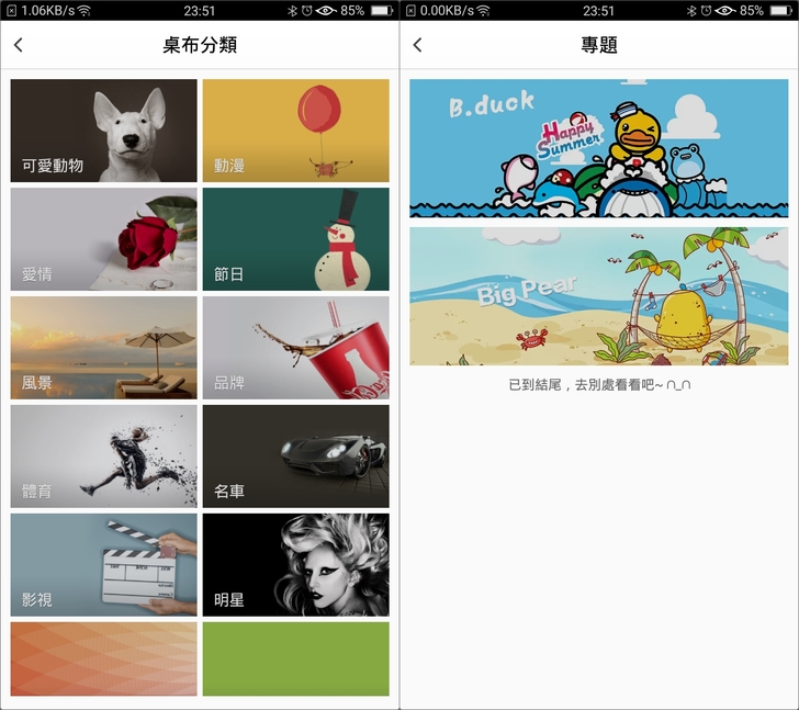 【▼】桌布分類常見有可愛動物、風景、名車與明星等,專題則有B.duck與Big Pea的卡通人物供選擇。