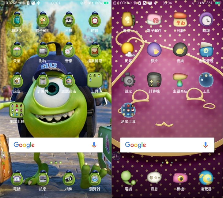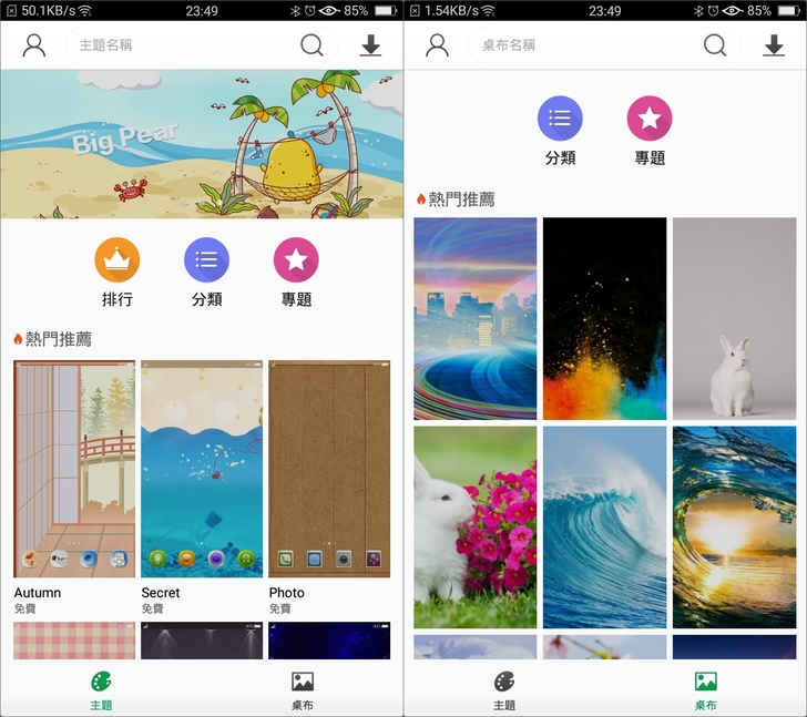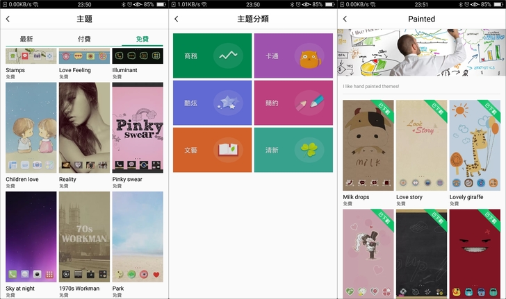 【▼】主題內容有分付費與免費,不過免費就多的換不完了,主題分類則有商務、卡通、酷炫、簡約、文藝與清新等,Painted專題則是除了桌布更換之外,小圖示也會跟著換。