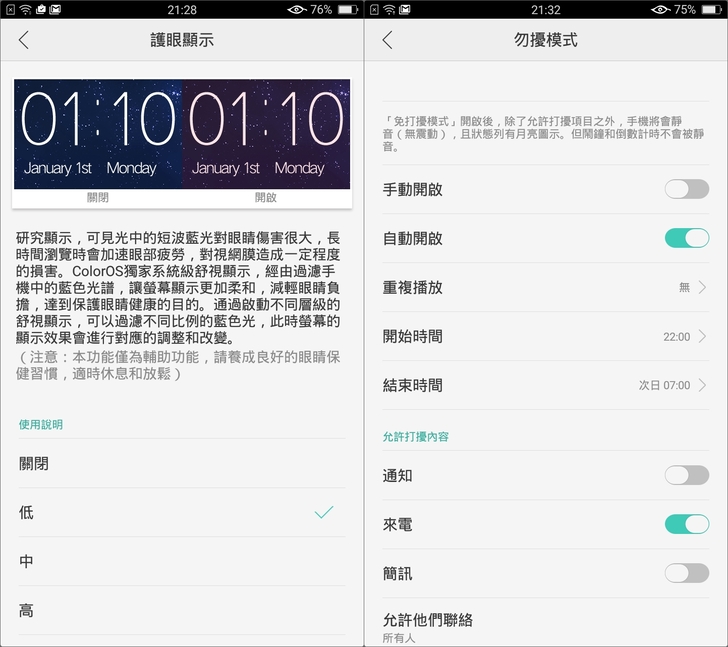 【▼】護眼顯示也是近期手機的趨勢,F1s內建抗藍光效果,不用再安裝抗藍光App了。而在勿擾模式中,可手動或自動開啟勿擾的時間,像睡覺時就可以將通知、來電或簡訊給關閉,但若是重要的人來電也可選擇特定的人才能允許打擾。