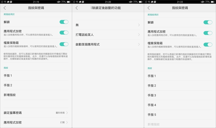 【▼】設定中的指紋與密碼,指紋除了可以解鎖之外,還可以開啟不同的應用程式甚至是撥號等,F1s最多可以設定五組指紋,除了自己的之外,家人的也可以加入。