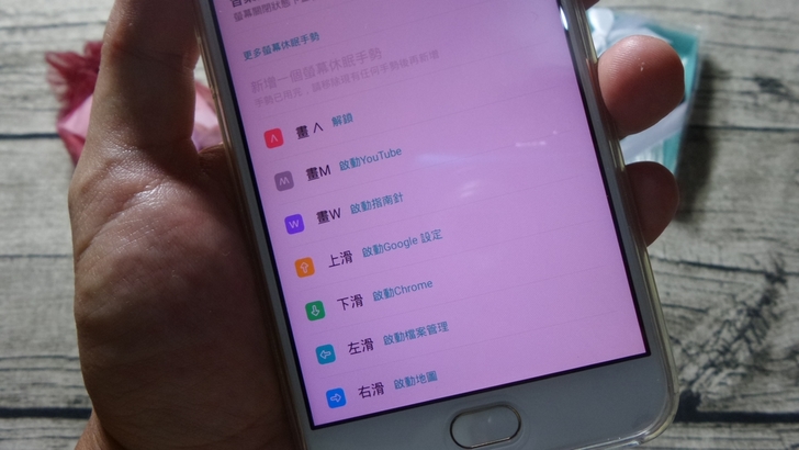 【▼】小編自訂幾個螢幕休眠手勢,例如倒V為解鎖、畫M為開啟youtube、畫W為開啟指南針、上滑為啟動Google設定、下滑啟動Chrome、左滑為啟動檔案管理、右滑為啟動地圖。