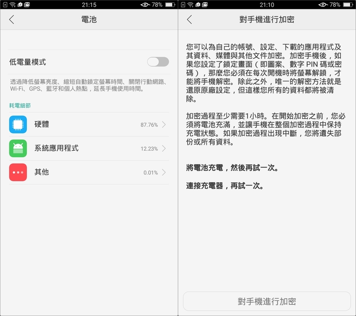 【▼】在F1s電池的部分,會顯示App耗電細節,當開啟低電量模式會降低螢幕亮度、關閉行動網路、Wi-Fi、GPS、藍牙與個人熱點。此外若您想對手機進行加密時,必須將電池充飽充滿,為的就是怕加密時沒電造成資料遺失,整個加密過程大約需經一個小時。