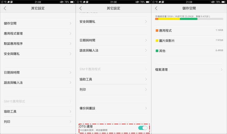 【▼】在其他設定中,有針對OTG連接作省電的機制,一般插上OTG沒多久,OTG隨身碟就超燙,這個功能開啟的好處能讓你OTG隨身碟獲得散熱的機會。