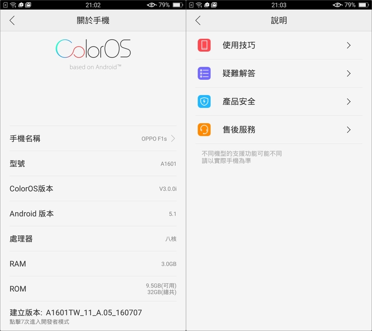【▼】最後是ColorOS3.0的資訊,版本為V3.0.0i,是由Android 5.1衍生而來,F1s 處理器為八核、3G RAM與32GB 的ROM,不論瀏覽網頁、執行多個App都能順暢執行。
