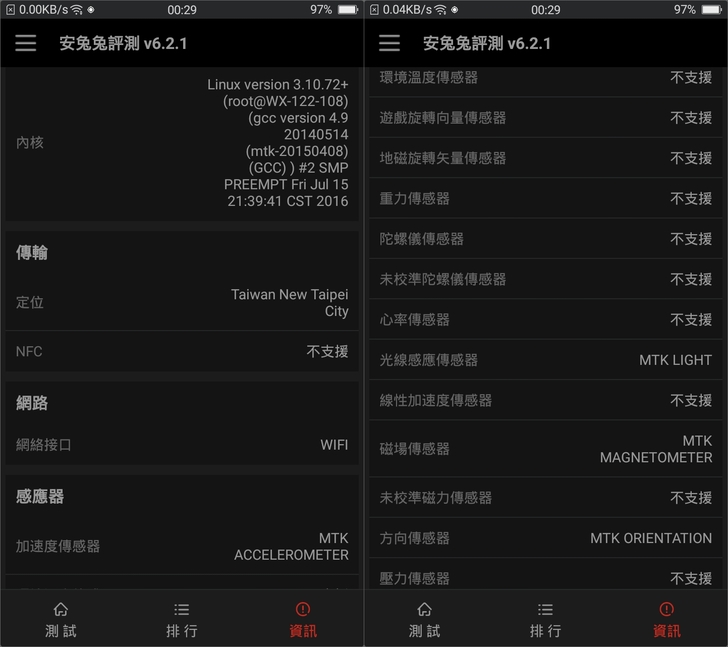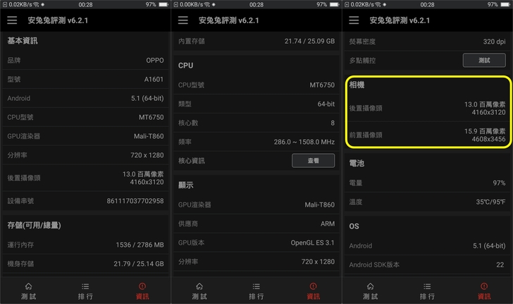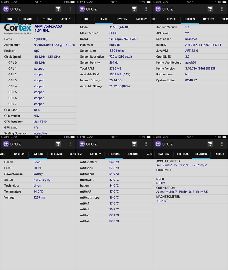 【▼】以CPU-Z查看F1s的處理器資訊,SOC頁面可隻核心為八顆CPU,架構是ARM Cortex-A53@1.51GHz,GPU則是採用Mali-T860。DEVICE頁面可知道使用Helio P10/MT675X,這可是媲美高通S625的台灣之光,5.5的像素密度為267 dpi,解析度為720x1280。其他頁面中還可知原生系統為Android 5.1及各核心版本,待機時處理器溫度大都維持在37度C左右。