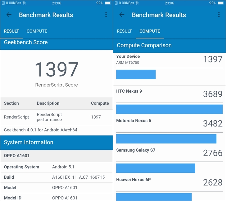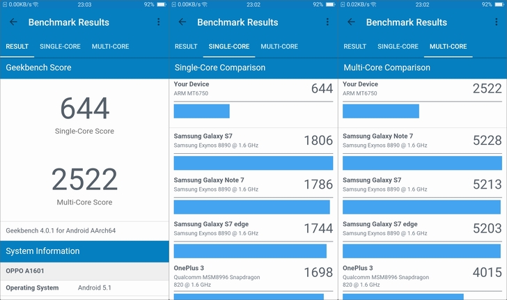 最後F1s在性能方面經過跑分 MT6750處理器 + 3GB DDR3 + 32GB (外接記憶體最高支援至128GB microSD) + 3075mAh 得到中等的評價,也許是調校好,使用上沒有太大延遲的感受,反而沒有高配處理器的發熱現象,電力也能撐更久,網路部分只提供2.4/5GHz 802.11 a/b/g/n,沒有提升到802.11ac也是可以加強之處。大家比較沒有注意的聲音部分,通話音量大,對方感受的背景聲也很小。播放音樂的音質由於較主觀,小編試聽感覺低音部分渾厚感不足,不過全局音效Dirac的支援,等化器就自個調校吧!