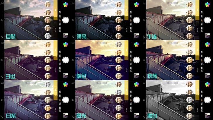 【▼】在F1s絢彩濾鏡中,提供了有高達九種的濾鏡效果,分別有自動、明亮、午後、日出、暖色、懷舊、日系、陽光與黑白,有時拍照多了濾鏡就多了一種味道呢~