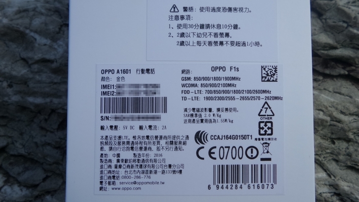 【▼】由於F1s是雙卡雙待的機種(支援LTE),所以有兩組IMEI都能在F1s包裝彩盒背面上查到,當然也有oppo A1601的產品序號。