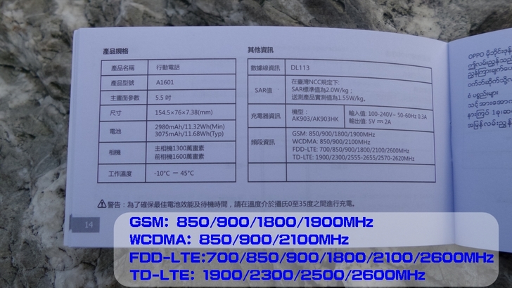 【▼】快速使用手冊有多國語言介紹,電池的說明要注意(預設為3075mAh,而最低為2980mAh),頻段2G GSM 四頻、3G WCDMA 850 + 900 + 2100、4G LTE 700 + 850 + 900 + 1800 + 2100 + FDD 2600 全頻、Cat 6,支援 2CA 載波聚合功能。