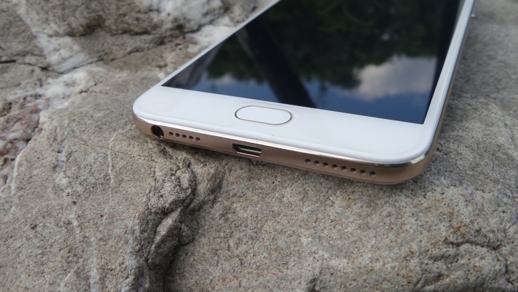 【▼】F1s在機身底部的部分依左至右為 3.5mm耳機孔、收音孔兼左擴音喇叭、microUSB連接孔與右擴音喇叭。