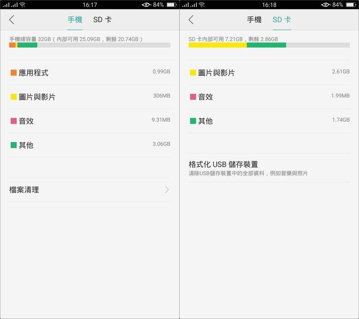 【▼】 F1s內建32GB的大容量,系統約佔7GB,所以整個內部可用為25GB,一般用戶應該很夠用,若不夠用再額外插入microSD記憶卡,最大可支援128GB。