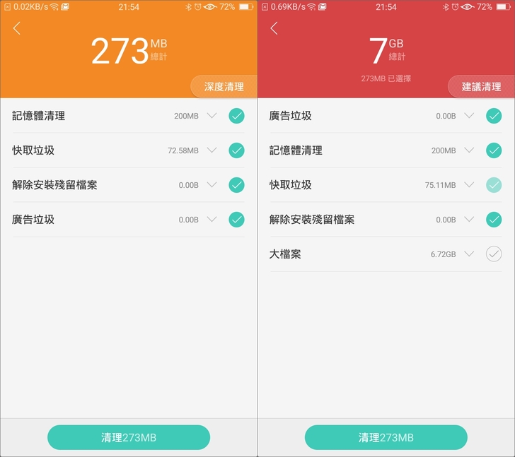 【▼】清理程度也分橘色的建議清理與紅色的深度清理,其中深度清理有大檔案清理,不過預設是沒有勾選的,怕說放了高清電影不小心就被清掉了。