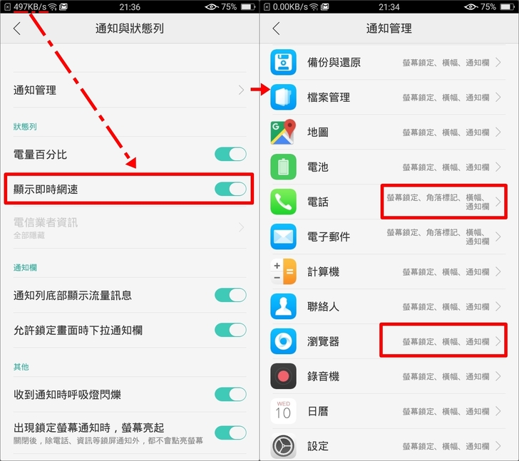 【▼】設定中的通知與狀態列,能顯示即時網速真的還蠻妙的,此外收到通知能以呼吸燈告知或是螢幕亮起,都是在開會時必備的開啟項目。通知管理則可以針對不同App進行螢幕鎖定、橫幅、通知欄或角落標記等告知。