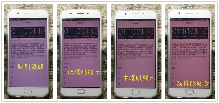 【▼】依左至右為關閉護眼效果、低護眼顯示、中護眼顯示與高護眼顯示,關閉護眼效果比較偏白偏藍,而高護眼顯示則略黃些。