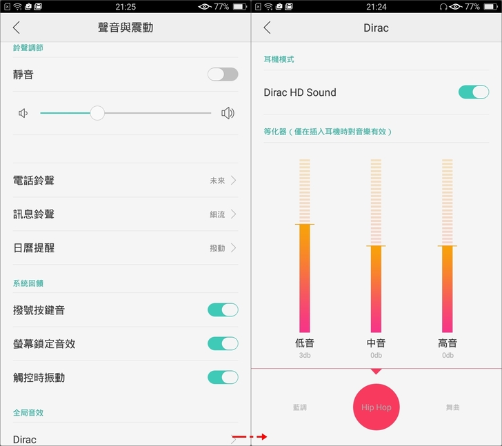 【▼】設定中的聲音與震動,這邊比較有趣的是全局音效的調整,Dirac HD Sound不論外放或耳機模式都能開啟,開啟後聲音比較不會那麼燜,會比較遼闊,而等化器就只有在插上耳機時才能調整,想要藍調、舞曲或是Hip Hop任君選擇。