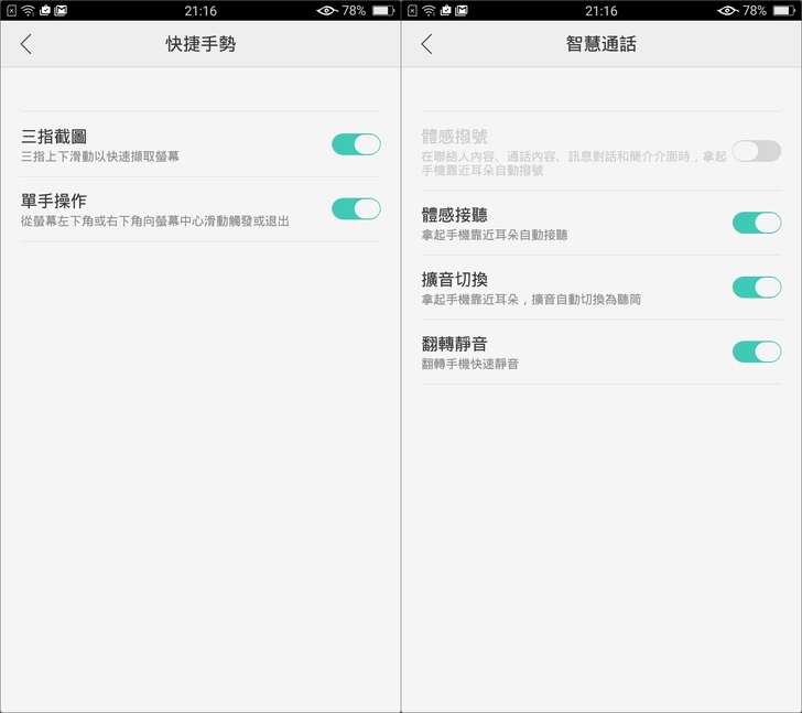 【▼】而在快捷手勢中,提供了三指截圖與單手操作的功能,智慧通話則有體感接聽、擴音切換與翻轉靜音等功能。