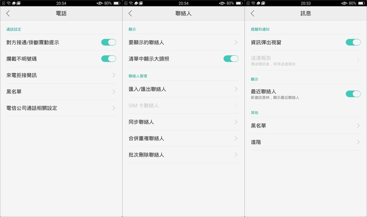 【▼】常用的電話、聯絡人與訊息設定,電話能攔截不明號碼;聯絡人中可在清單中顯示大頭貼,若有重複聯絡人(姓名與號碼)狀況時,系統會自動合併;訊息多媒體的大小上限為300KB,並支援WAP推播。