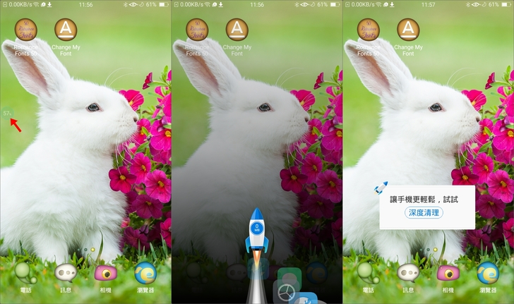 【▼】顯示加速球就是圖中57%的圈圈,用手指輕壓移至下方的火箭框,火箭就會高速起飛,代表F1s已幫你釋放不必要的記憶體。