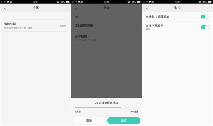 【▼】在多媒體的設定中,相簿能清除快取(保留快取會加速照片仔入速度),音樂能定時關閉音樂(最長90分鐘),影片則能循環播放以及本機字幕顯示。