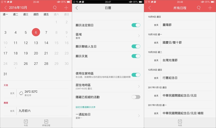 【▼】ColorOS 3.0的日曆能顯示農民曆,更能顯示聯絡人生日與今日天氣,連最近吵很兇的法定假日也能顯示,真的蠻有趣的。