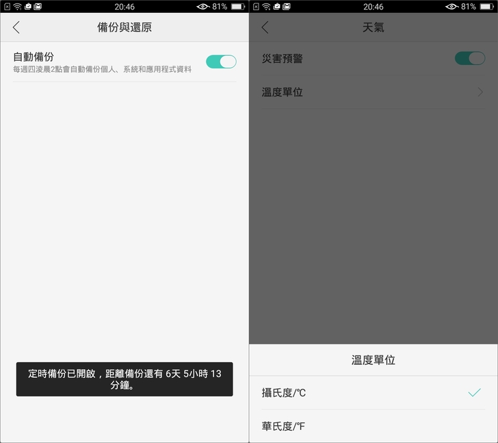 【▼】設定中的備份與還原,會於每週四凌晨2點進行備份個人、系統與應用程式資料,為什麼只能選擇週四凌晨2點,這有待原廠來解釋了。天氣的部分能切換攝氏度C與華氏度F的溫度單位,並提供災害預警,當地震來就會收到訊息。
