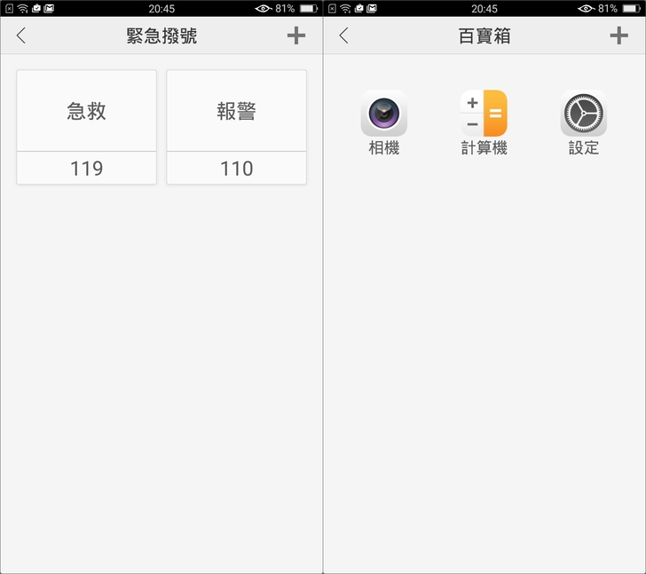【▼】緊急撥號有急救的119與110報警,百寶箱預設提供了有相機、計算機與設定,不夠還可以自行加入。