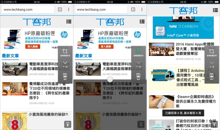【▼】在F1s中也提供了長截圖的功能,主要透過音量調大鍵與電源鍵一起複合來達成,除了總共能抓取八頁之外,還能針對螢幕截圖區域作調整,對於查看長篇大論的文章來說,真的很有幫助。