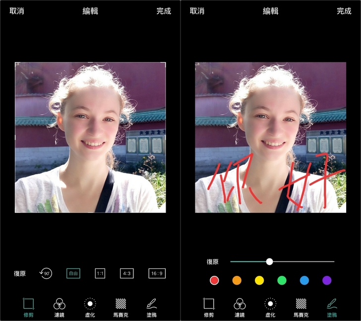 【▼】F1s相片編輯中能針對照片作翻轉、剪裁與塗鴉,為了表示尊重,請了俄羅斯妹子寫下你好。