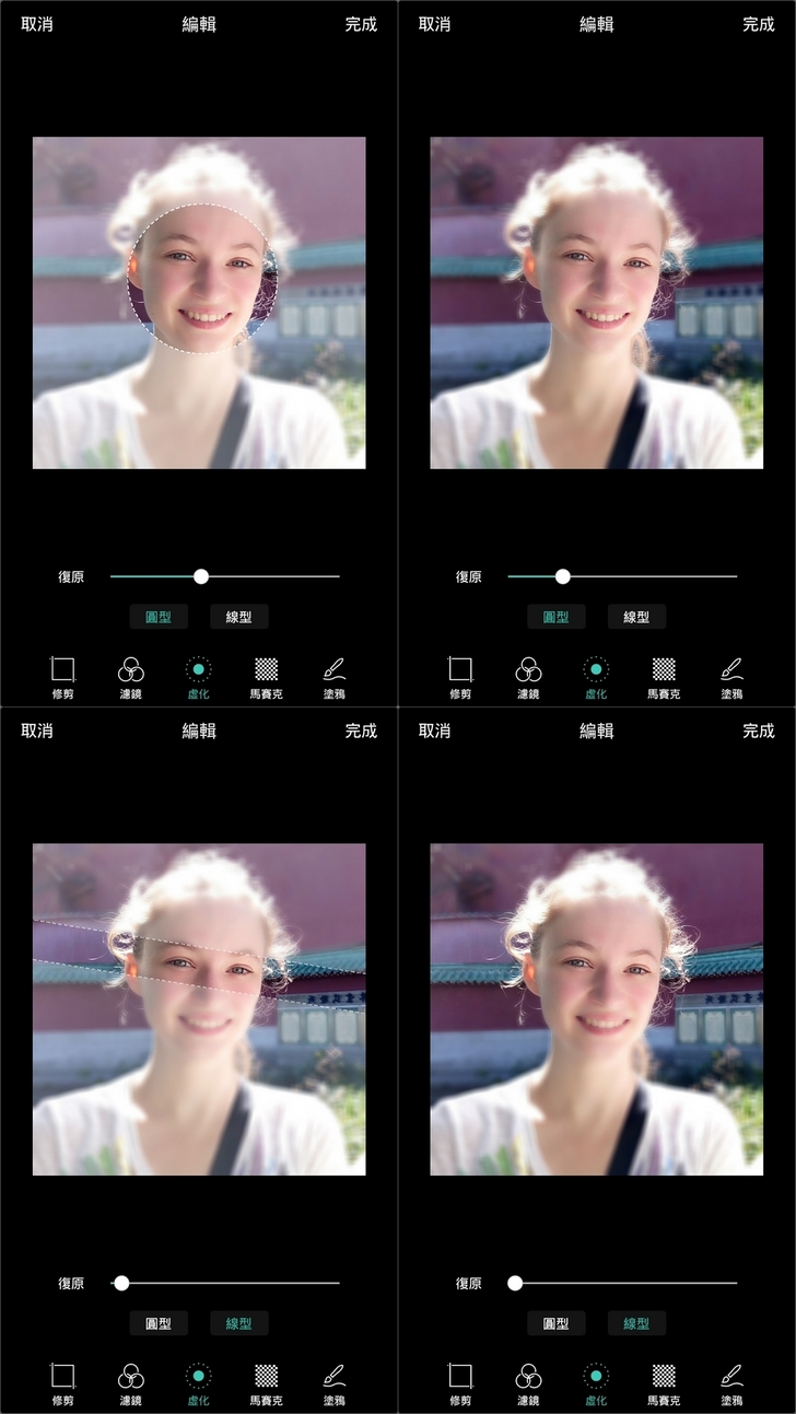 【▼】F1s相片編輯中虛化的功能,提供圓形與線型虛化,虛化範圍可以自訂,但虛化程度是固定的。