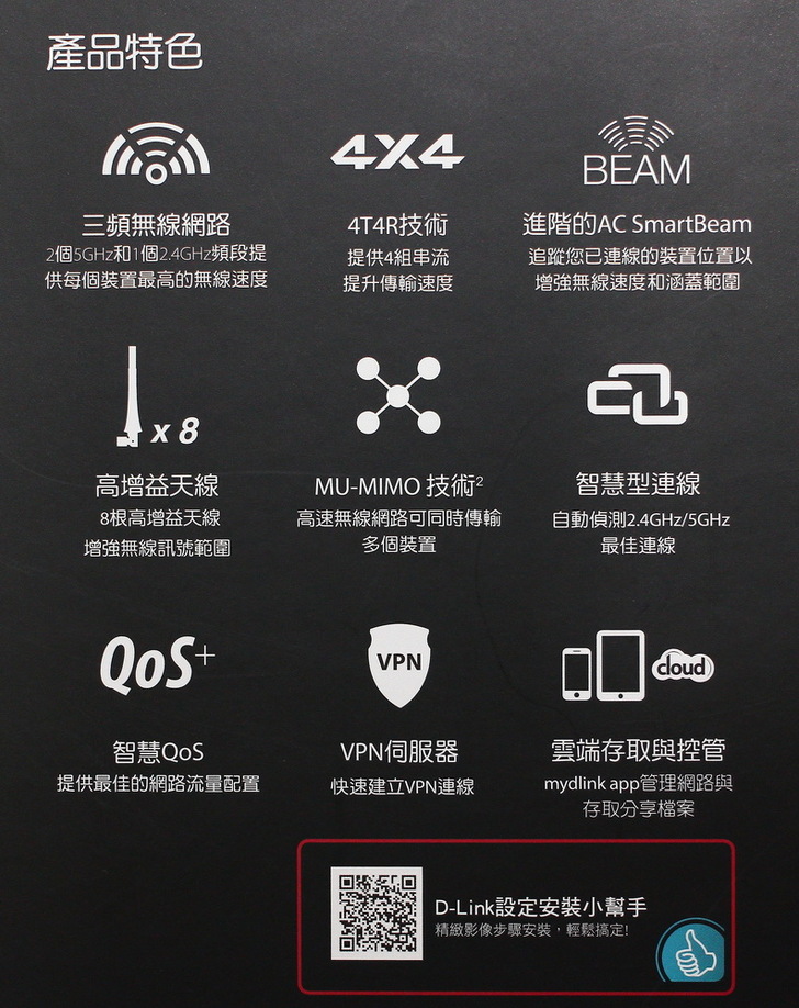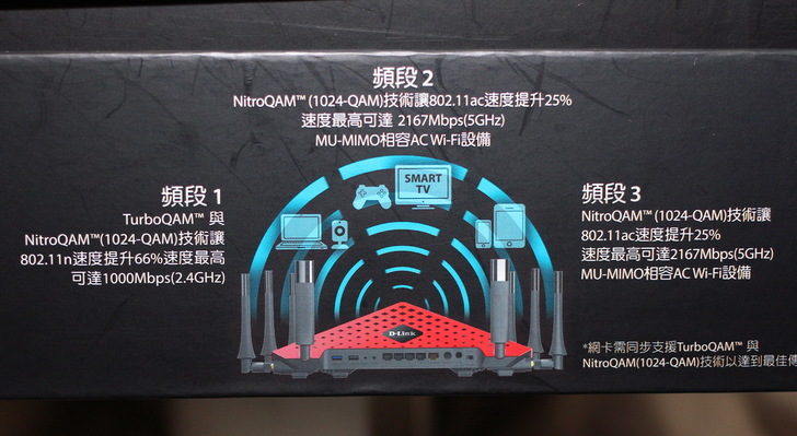 這次要開箱的 D-Link DIR-895L,身懷多項頂級無線技術科技規格,支援MU-MIMO同步多工處理技術、NitroQAM技術、4T4R高速串流、最高 AC5300無線傳輸效能、AC SmartBeam智慧天線,真可說是一台網路超級猛獸。