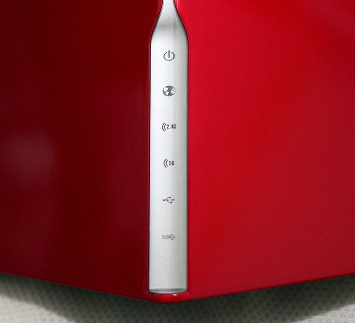 ▼ 本體中間的顯示燈號,由上而下分別是 電源開關、網際網路、2.4GHz 無線網路、5GHz 無線網路、USB 2.0、USB 3.0。