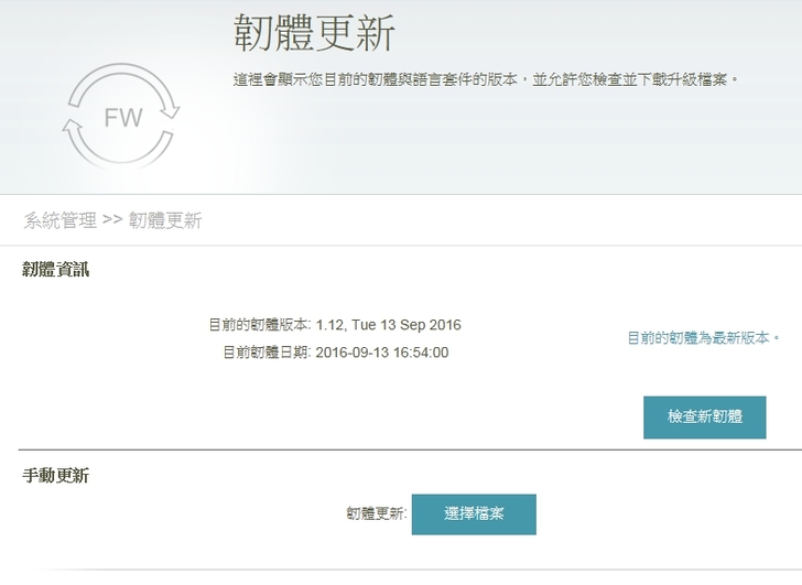 ▼「韌體更新」顯示目前的韌體與語言套件的版本,可檢查有沒有新韌體可以進行更新。