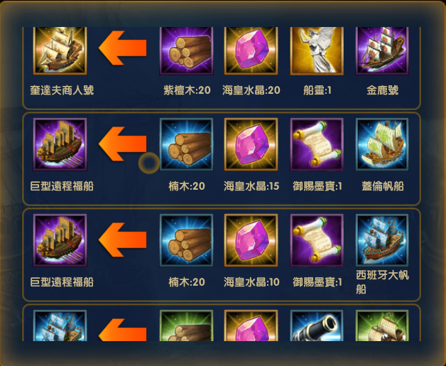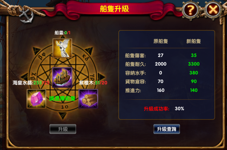 船隻升級,可以通過特定的材料將低級的船隻升級成高級,橙船不是夢。升級有一定的成功率,如果升級失敗,只會扣除升級材料,完全不用擔心受升級船隻會消失。如果不知道船隻如何升級,可以通過升級介面,點擊升級查詢升級路線圖,這樣就不會錯過升級材料啦。