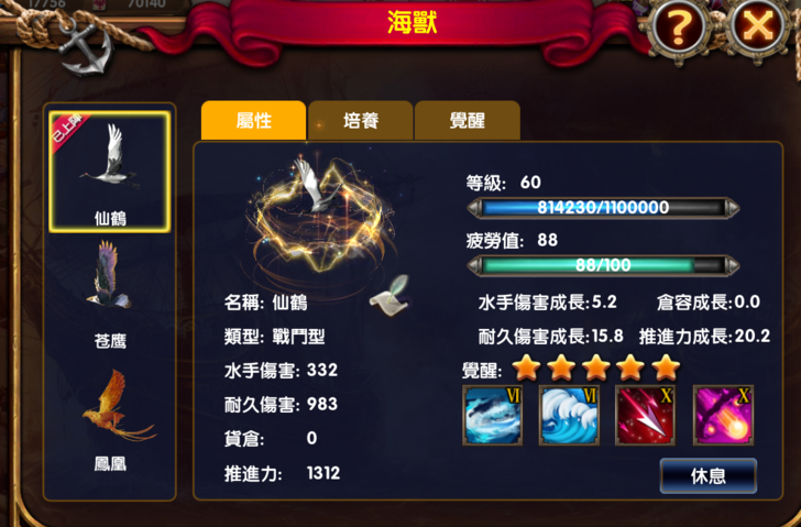 海獸培養系統一共推出了三款海獸:鳳凰(貿易型)、仙鶴(戰鬥型)、蒼鷹(戰鬥型)。每種海獸最多可以獲得一隻,不可重複獲得。