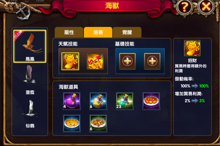 鳳凰:貿易必備,獨有的貿易技能,再搭配上貿易型組合船長。我的天啊,要賺大發了。