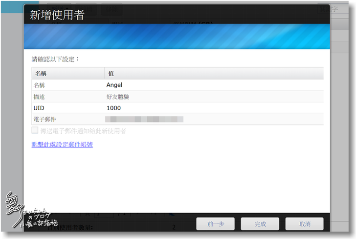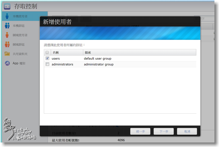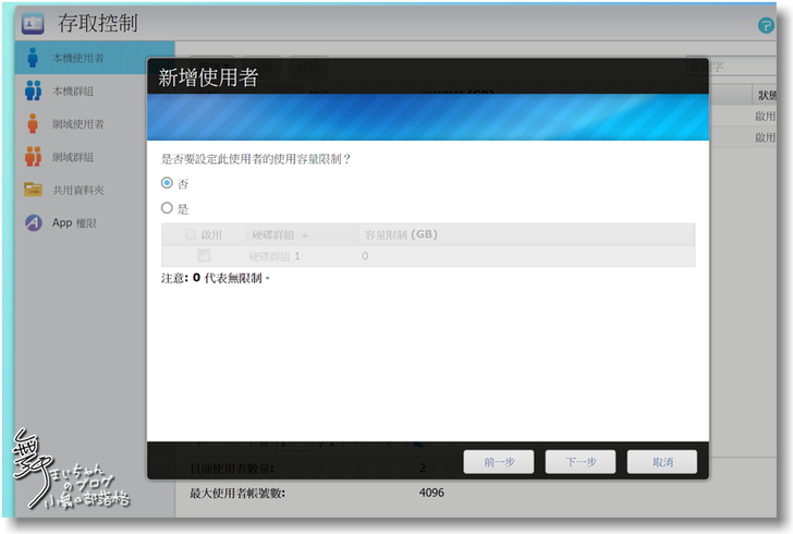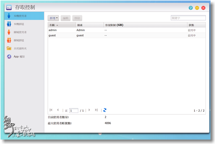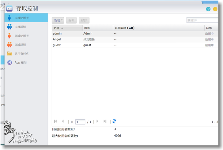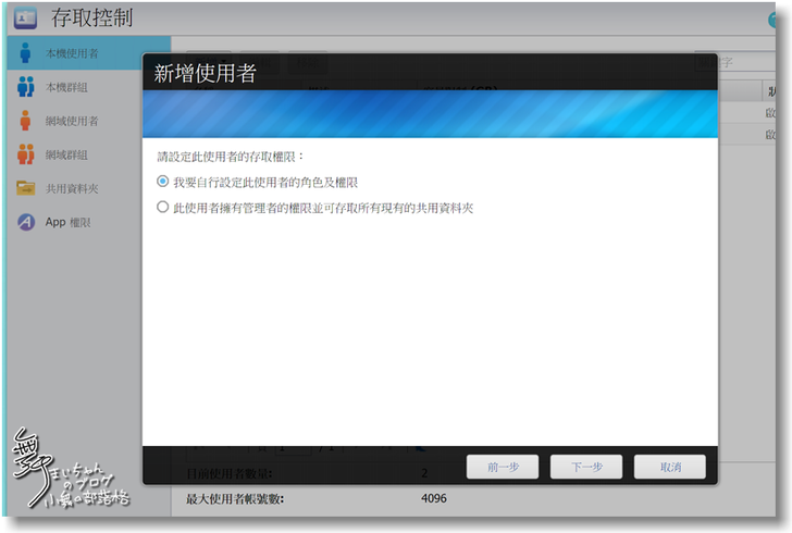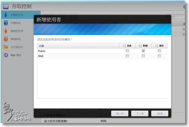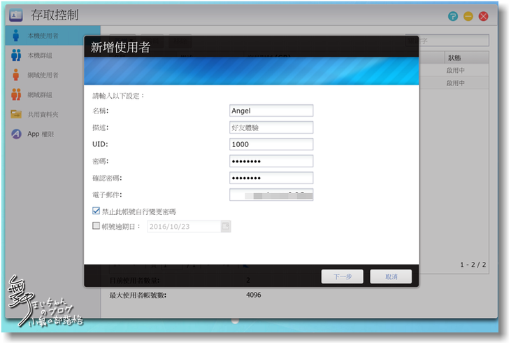 ▲然後第二步就在『存取控制』中,另外建立一個帳號給朋友使用。