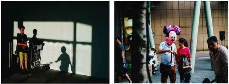 信義商圈,週末總是人潮爆滿。也是街頭攝影師們最容易找到靈感的地點。有人覺得街頭攝影是不斷地走動,但更多時候街頭攝影靠的是等待,經驗,以及些許的運氣,就像上面這張照片。(如下右圖)