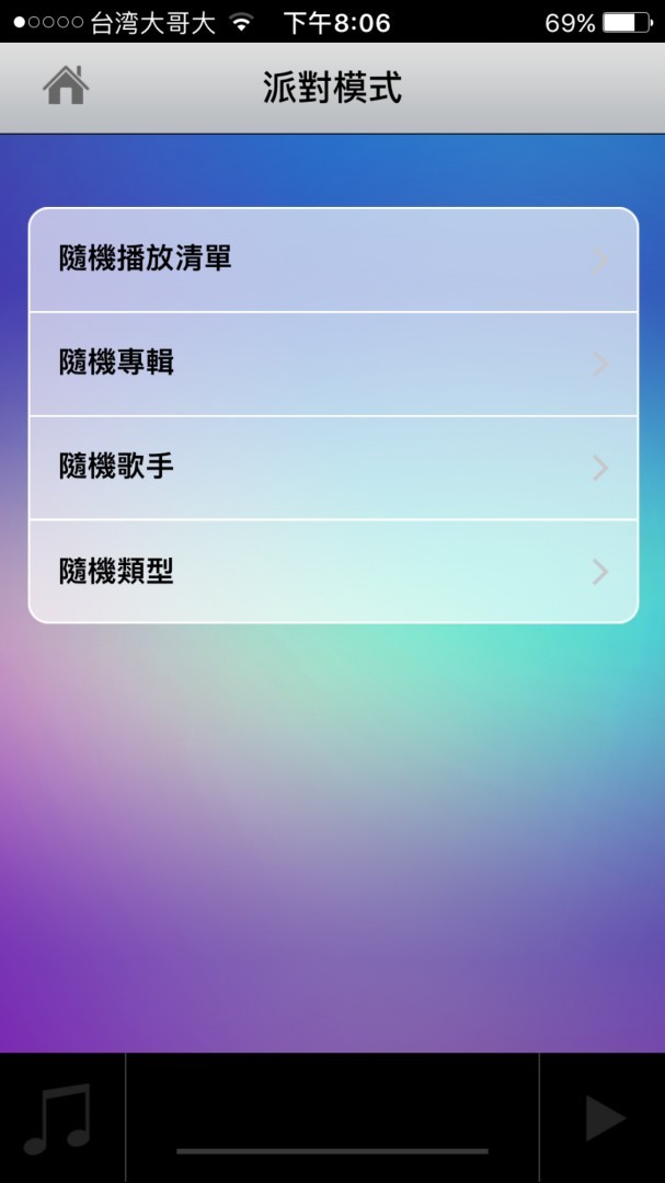 ▼AiMusic還有一個蠻有趣的功能,就是這個「派對模式」,進入派對模式點選清單或專輯、歌手、類型APP便會從檔案中隨機挑選歌曲做播放,蠻不錯的,很適合與親友一起同樂使用。