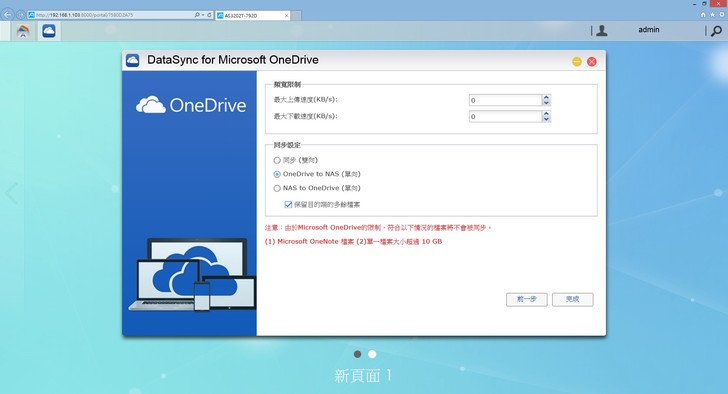 ▼同步時可以對同步服務的頻寬做限制,避免佔據太多的網路流量;另外同步有三種方式來運作,這邊我是選擇2 OneDrive to NAS。